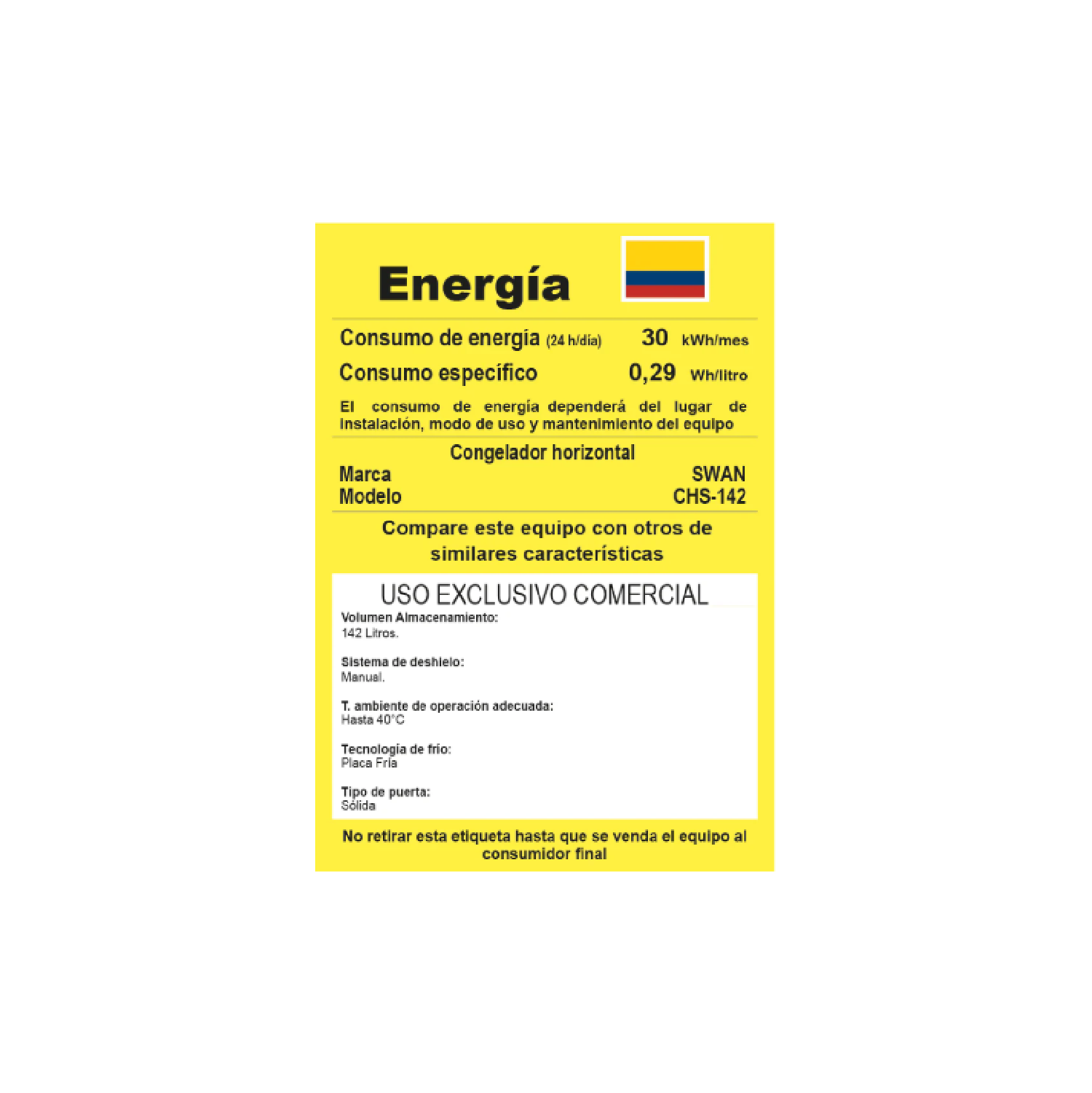Descubre la eficiencia y practicidad del Congelador Swan CHS-142, diseñado para satisfacer tus necesidades de almacenamiento en espacios reducidos. Con sus dimensiones de 73x52x85 cm, este congelador ofrece una capacidad bruta de 142 litros y un peso neto de 30 kg. Con una sola puerta, proporciona un acceso conveniente a su interior, que cuenta con un gabinete interno revestido de lámina blanca para garantizar una óptima conservación de los alimentos congelados. Destaca por su eficiencia energética, con un consumo mensual de 31,02 kWh y una corriente de 1.21 A, lo que no solo ayuda a reducir costos operativos, sino que también respeta el medio ambiente. El Congelador Swan CHS-142 incluye dos canastas que facilitan la organización y acceso a los productos almacenados, mientras que su temperatura de operación a -18°C asegura condiciones ideales para la preservación a largo plazo. Obtén rendimiento y conveniencia en un diseño compacto con el Congelador Swan CHS-142.