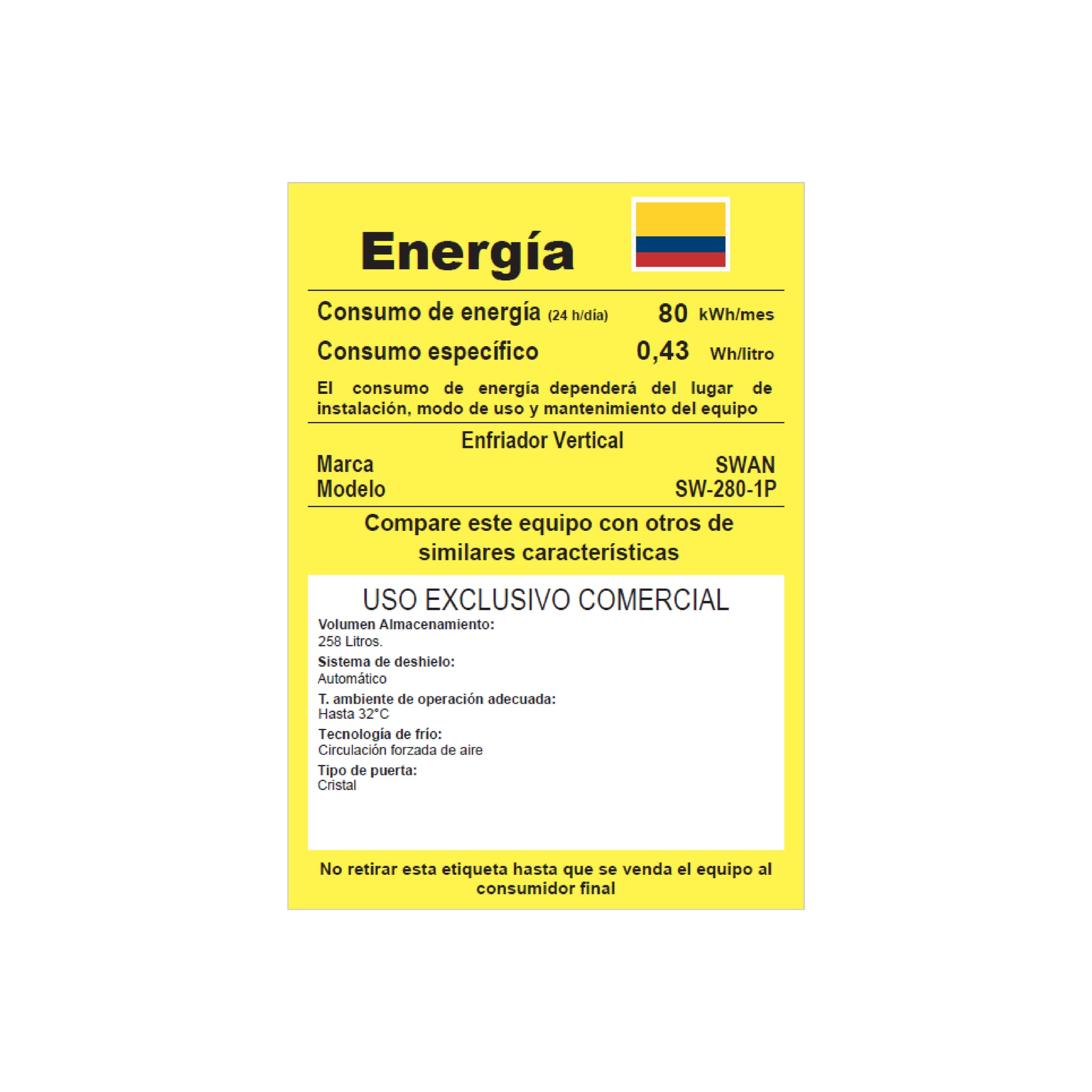 La Vitrina vertical SWAN SW-280-1P está diseñado para uso comercial con un rango de temperatura entre 1 °C y 10 °C y capacidad de 258 litros netos. Equipa un sistema de refrigeración por ventilador que distribuye el frío de forma uniforme, descongelación automática y bandeja de auto-evaporación para fácil mantenimiento. Incorpora control mecánico con display de temperatura, iluminación LED, 4 estantes ajustables y cerradura con llave, además de aire caliente anti-condensación que asegura máxima visibilidad. Una solución robusta y confiable para la exhibición de productos refrigerados.